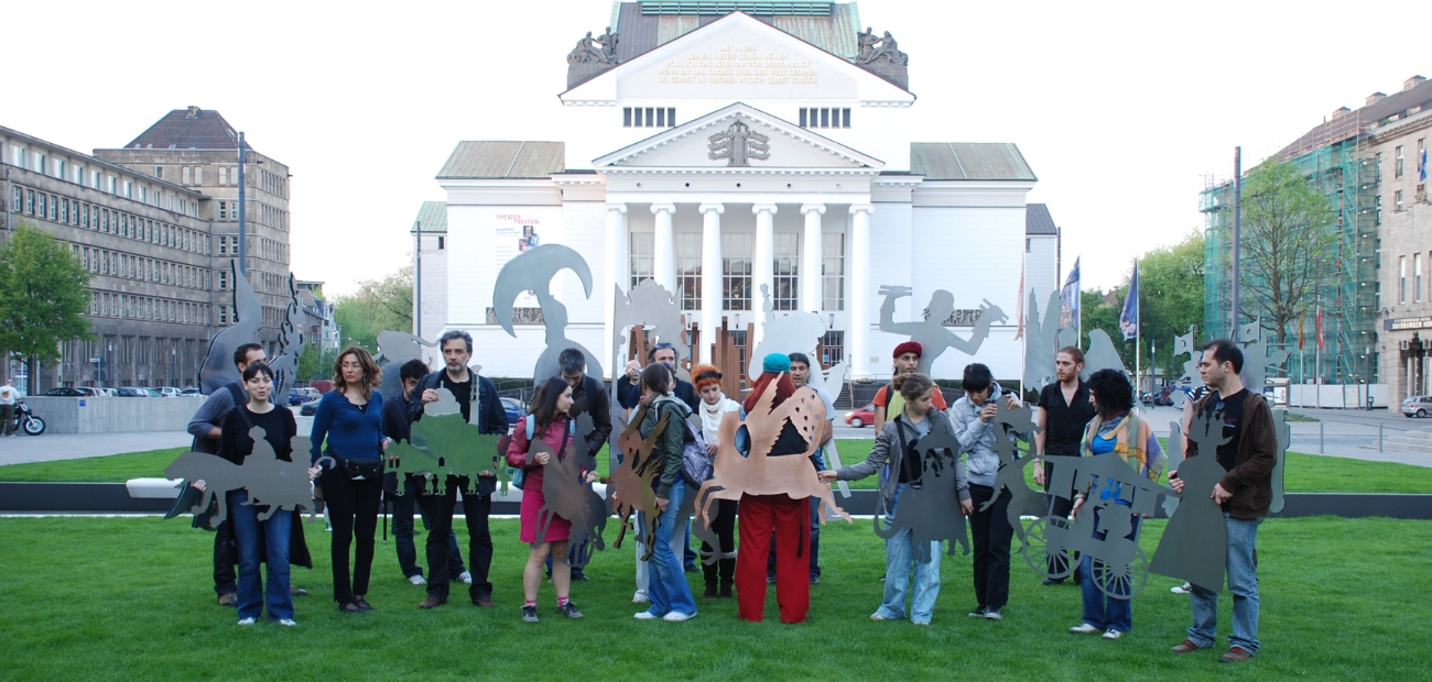 Combining video projections on surrounding buildings, music, mobile sculptures, and live performance—along with interactive elements such as dancing halay with the people of Duisburg—this public square performance was conceived as a one-time event for the festival’s opening.