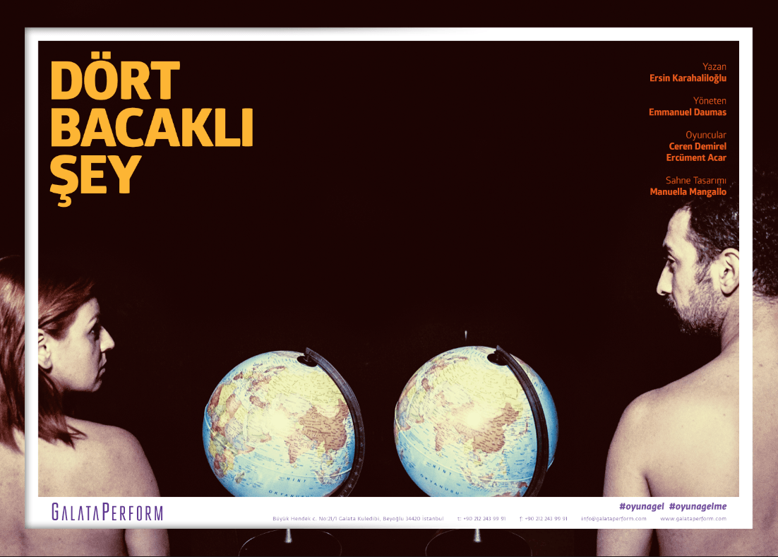 Yeni Metin Yeni Tiyatro projesinin kazanımlarından genç yazar Ersin Karahaliloğlu ilk oyunu ‘Dört Bacaklı Şey’ ile GalataPerform repertuarında. Yazarın bu ilk oyununu Fransız yönetmen Emmanuel Daumas yönetti. Yazar, kadın erkek ilişkilerini absürt bir kurgu içerisinde uçuk bir dille eleştiriyor. Bir ev, bir kadın, bir adam ve bir masa… Bu dört nokta ‘Dört Bacaklı Şey’i temellendiren ana etmenler. Bir türlü birbirini anlayamayan kadın ve erkek o eve nerden ve nasıl girdiği anlaşılamayan masanın gizemini çözmeye çalışırken sıra dışı bir var oluş sorgulamasının içinde bulurlar kendilerini. Basit bir obje kördüğüm olmuş bir ruh halinin aynasına dönüşüyor ve bunu seyirciyle adım adım gerçekleştiriyor.